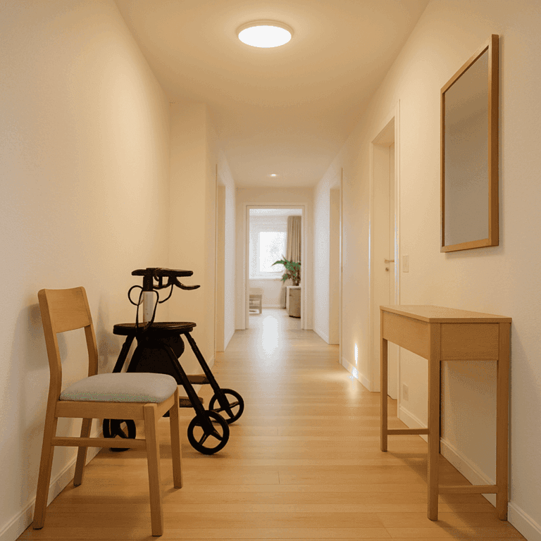 Im Eingangsbereich und Flur sollten Wege breit, gut beleuchtet und frei von Hindernissen sein. Das erleichtert den Einsatz von Rollator oder Rollstuhl und sorgt für Sicherheit bei nächtlichen Wegen. Auch die 24-Stunden-Pflegekraft profitiert von ausreichend Bewegungsfreiheit und klaren Strukturen.